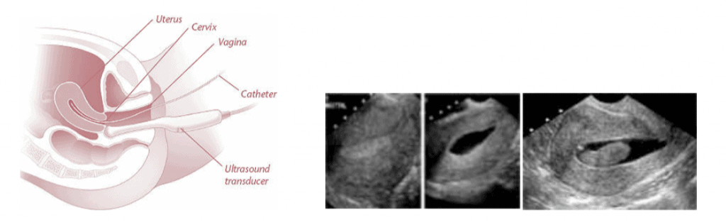 Ecografia este apoi efectuată prin tehnica transvaginală. Această metodă permite vizualizarea maselor comune asociate cu sângerarea uterină anormală, infertilitatea, avorturi recurente cum ar fi: Polipi endometriali; Leiomioame submucoase; Cheaguri sangvine intracavitare; Defecte congenitale uterine; Aderențe endometriale/ sinechii.